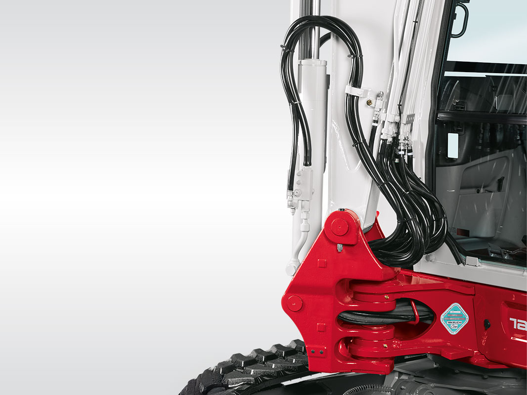 Optional können die Takeuchi Bagger mit dem Schnellkupplungssystem TAKLOCK ausgerüstet werden, mit dem Sie die Hydraulikleitungen für Anbaugeräte wechseln können, auch wenn diese unter Druck stehen.